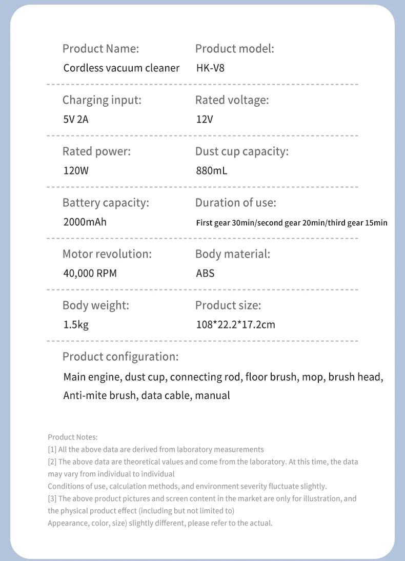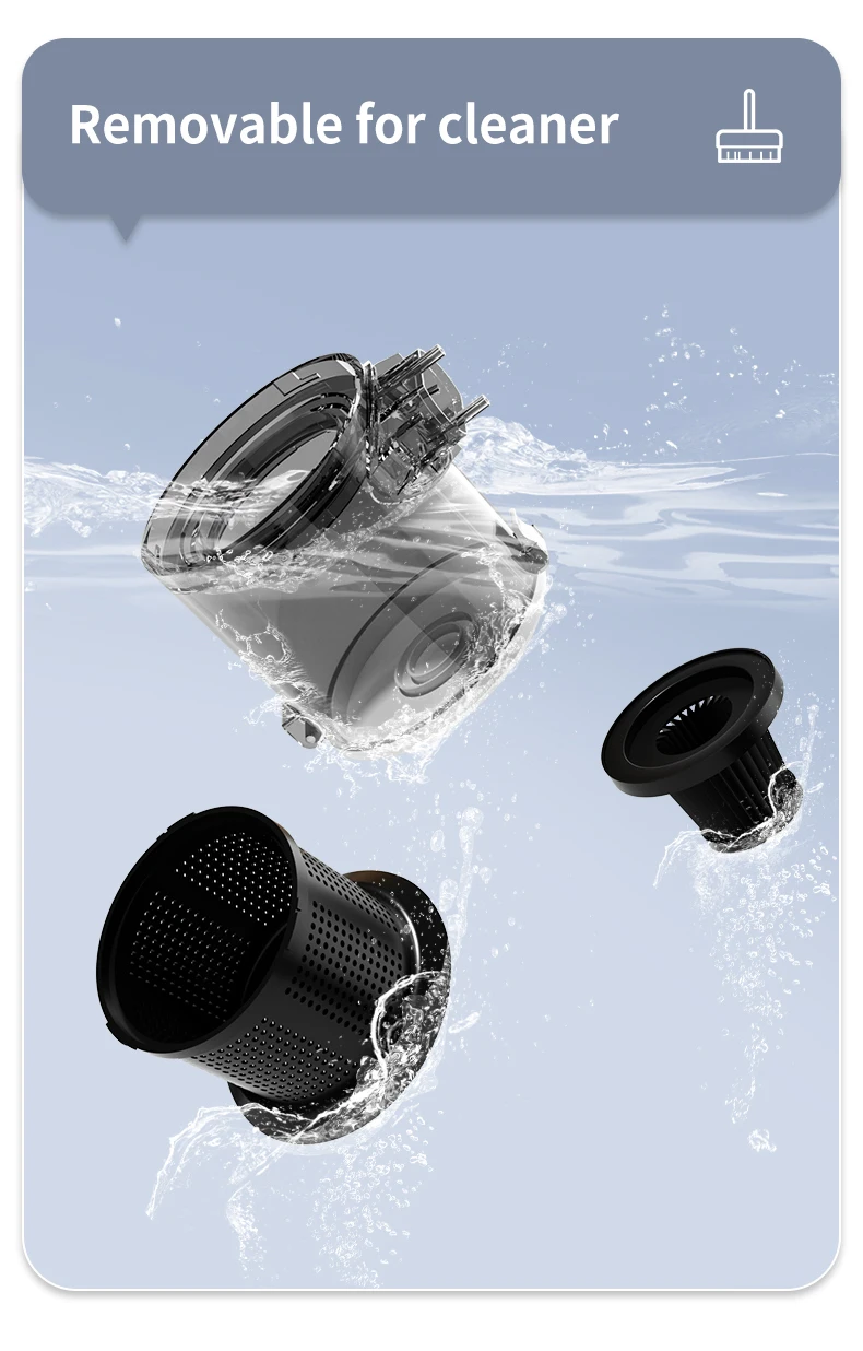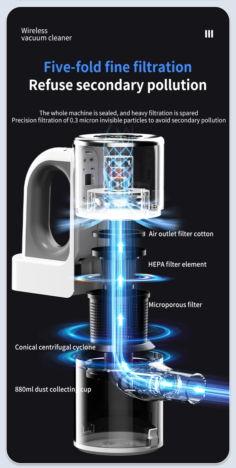 HEPA Filter + Microporous Filter + Conical Cyclone: Traps 99.97% of dust and allergens.