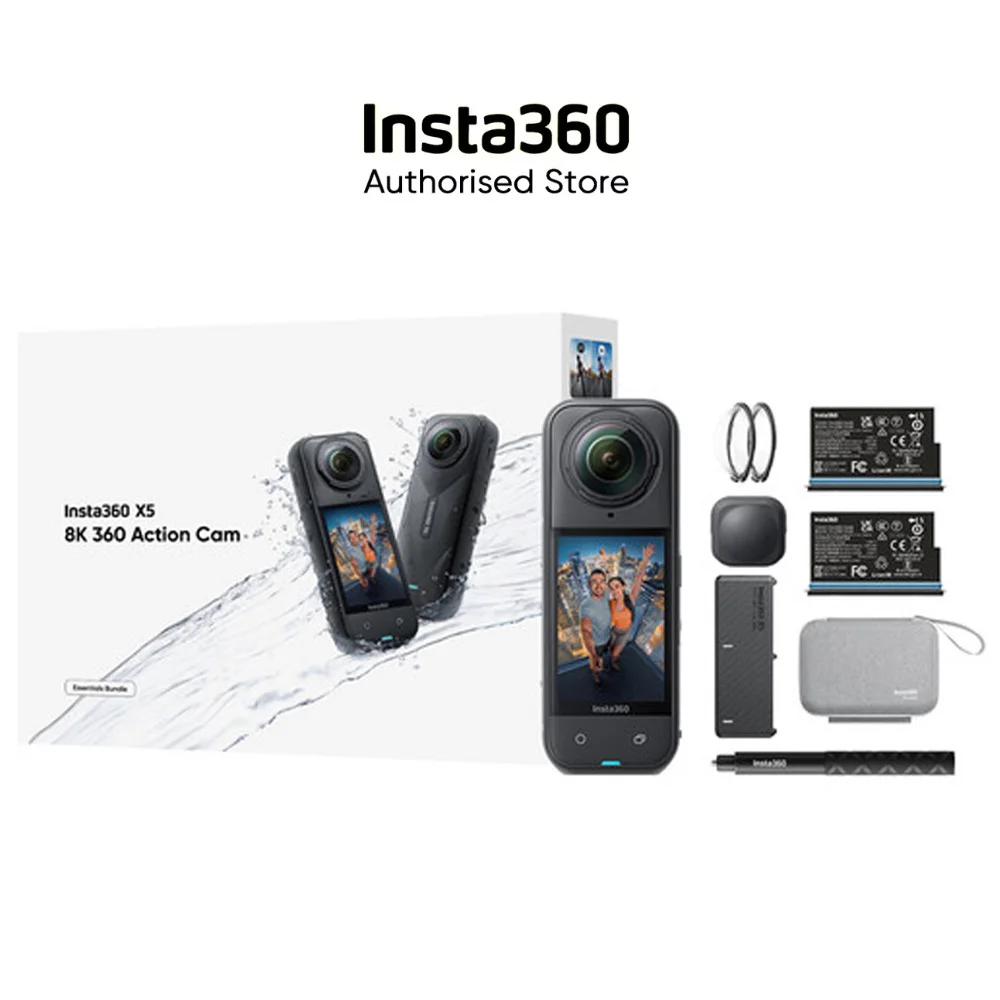 Essentials Bundle includes 1x Insta360 X5, 1x Additional Battery, 1x Utility Fast Charge Case, 1x 114cm Invisible Selfie Stick, 1x Standard Lens Guards, 1x Lens Cap and 1x Carry Case. We will give away a screen protector as a gift.