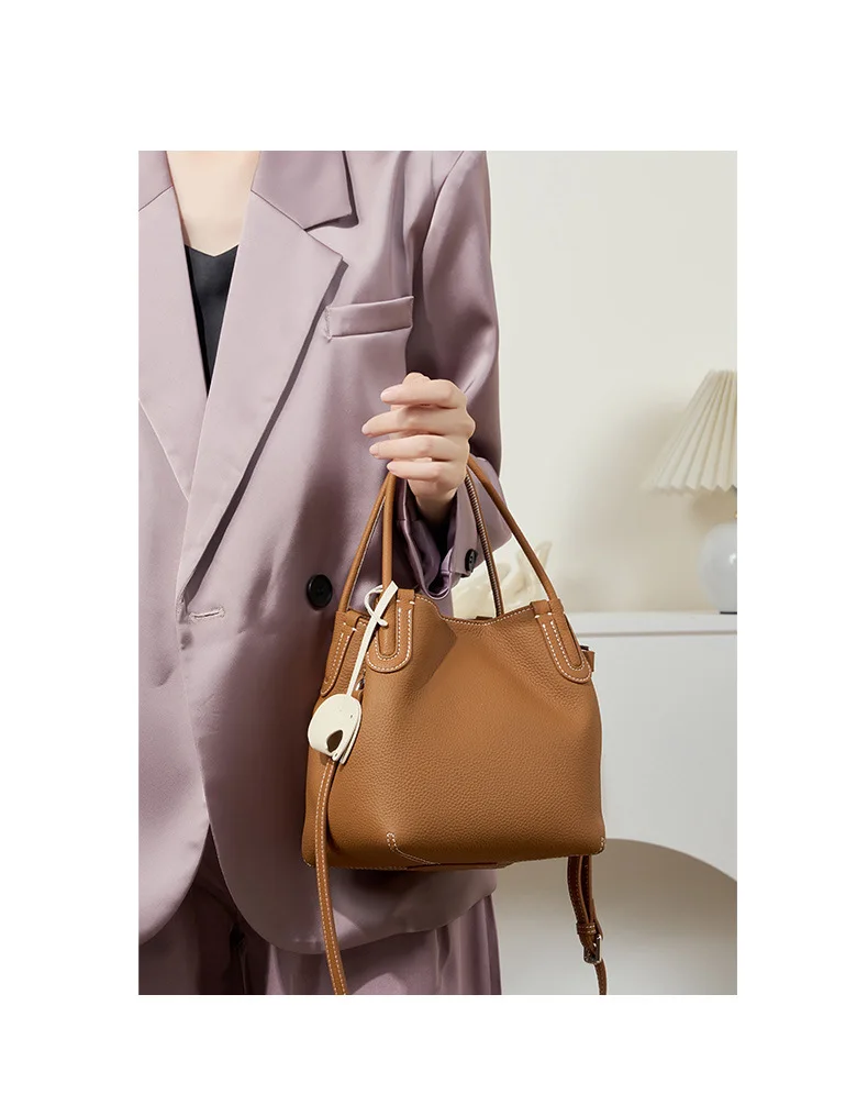 This bucket bag is super cute! The leather feels amazing, and the size is just right. I get tons of compliments!